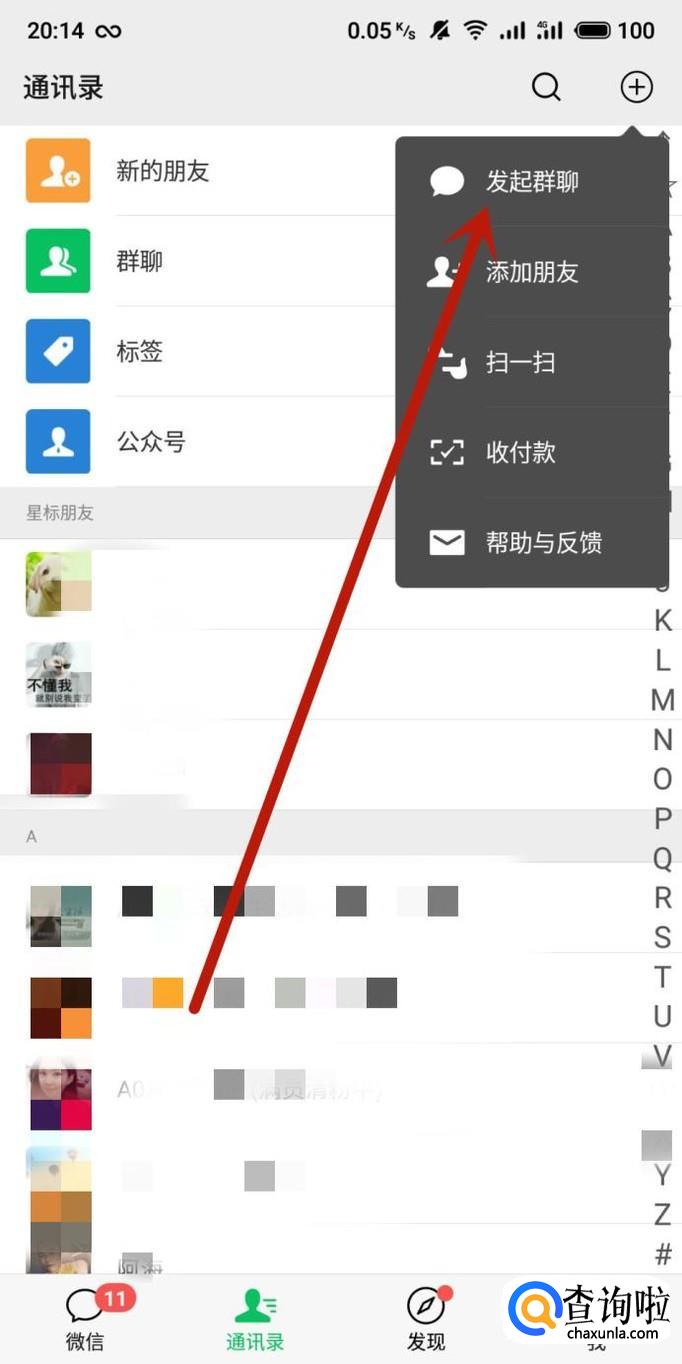 在微信通讯录页面找到“发起群聊”,如图所示。