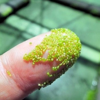 无根萍(Wolffia arrhiza),亦称“芜萍”、“薸沙”。单子叶植物,浮萍科。无根萍属水生植物。是一种漂浮于水面上的椭圆形或卵圆形绿色粒状体,各地池塘或稻田均可见,是主要养殖螺类、鱼类,鱼种阶段适口的优良饵料。芜萍培养简易,产量高,营养丰富,无根萍为种子植物中体型最小的一种,无根无叶,叶状体近球形,长约1.3-1.5mm,宽不到1mm。多数先端产生芽体繁殖。浮生在静水池沼的水面。花小,雌雄同株,生于叶状体表面,无佛焰苞。不常开花。果实球形。一般用芽繁殖。广布于世界各地,中国东南各地均产,春夏间常见于水稻田内。为鱼苗的优质天然饵料。