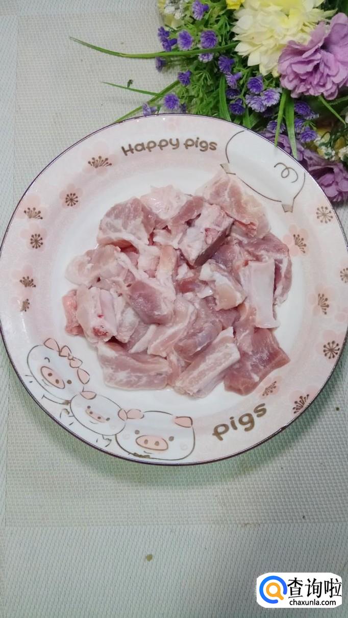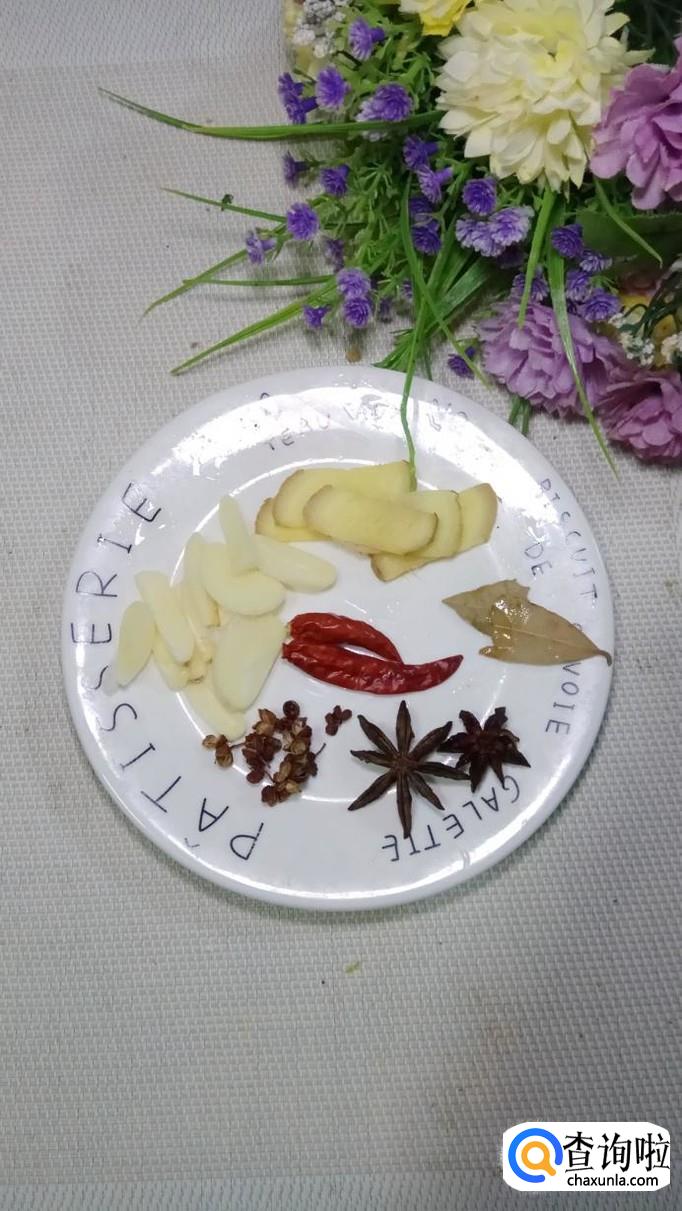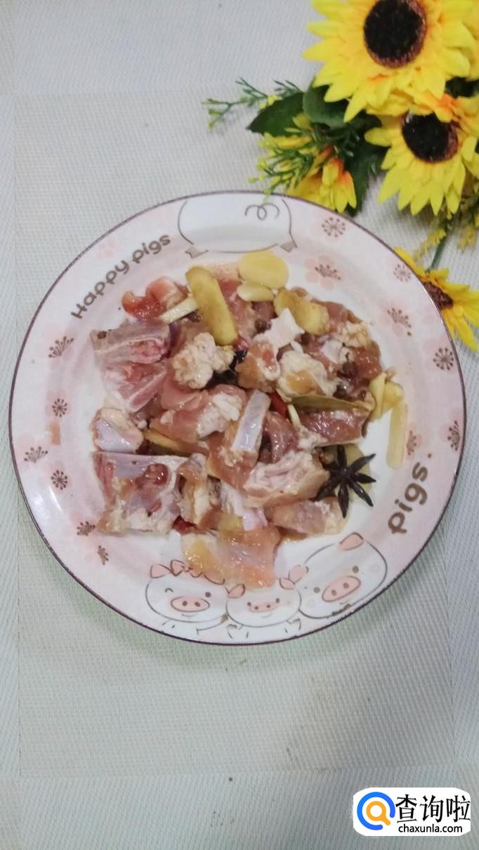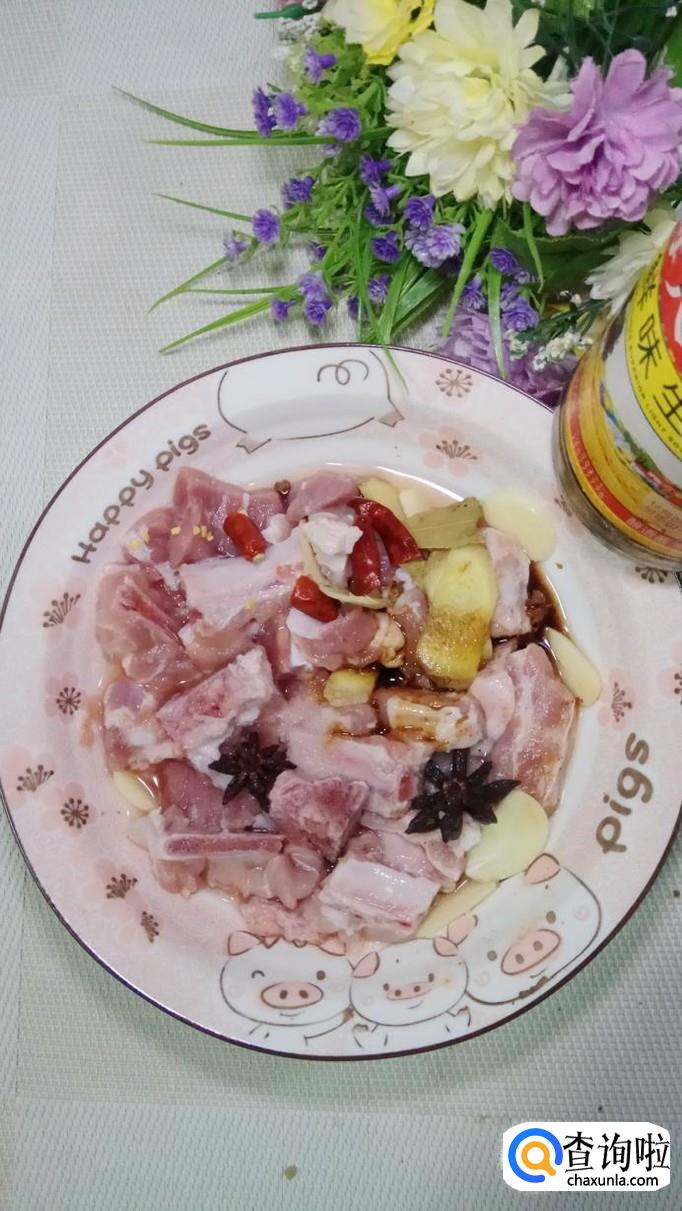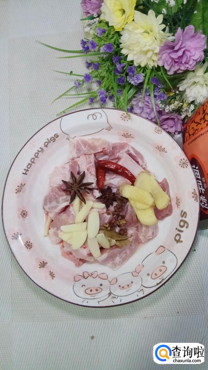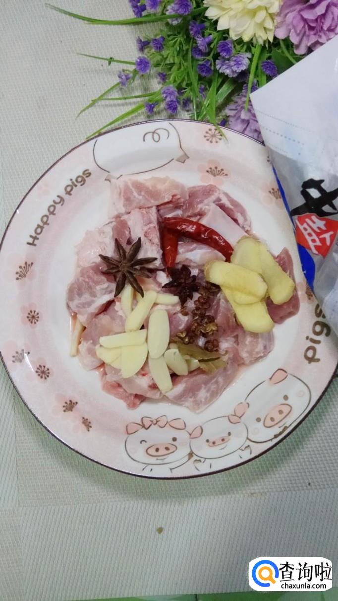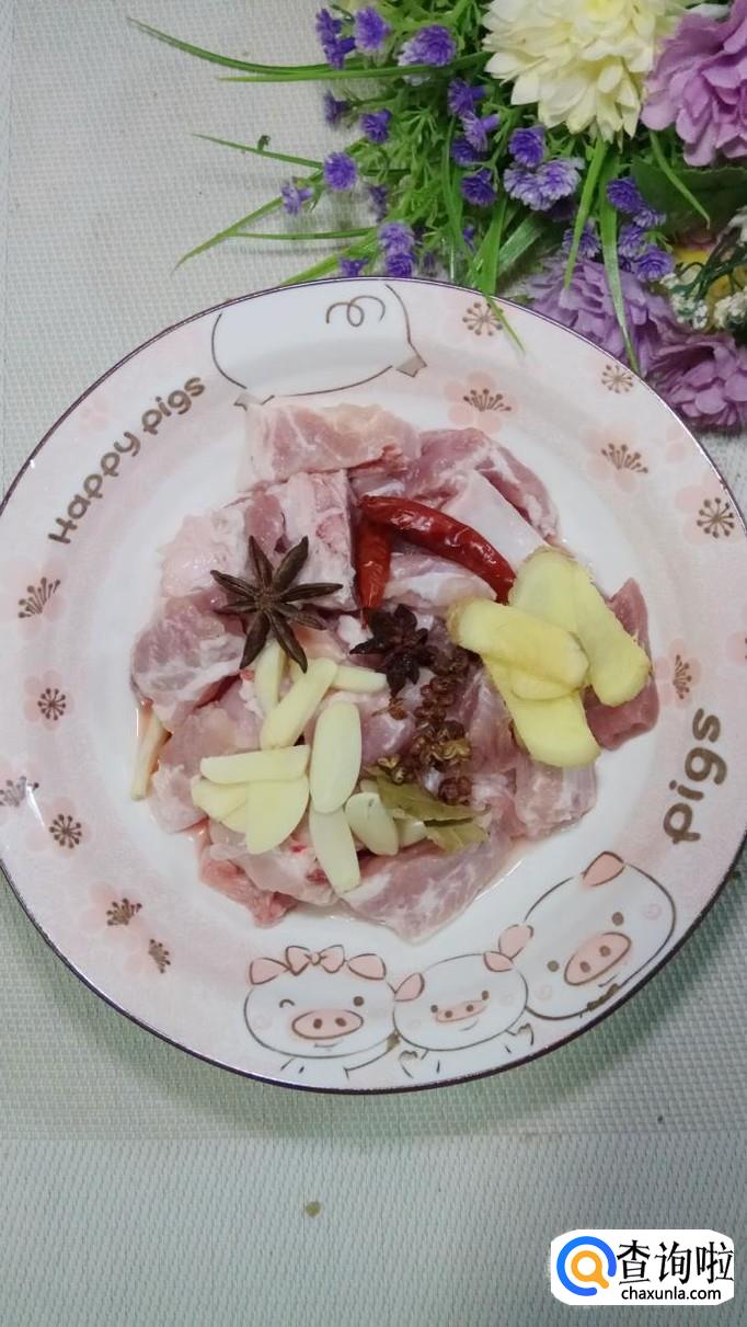 准备适量排骨,用清水泡一下,洗净备用,再准备适量花椒,八角,干辣椒,香叶,姜片儿,蒜片,等大料放入排骨中。