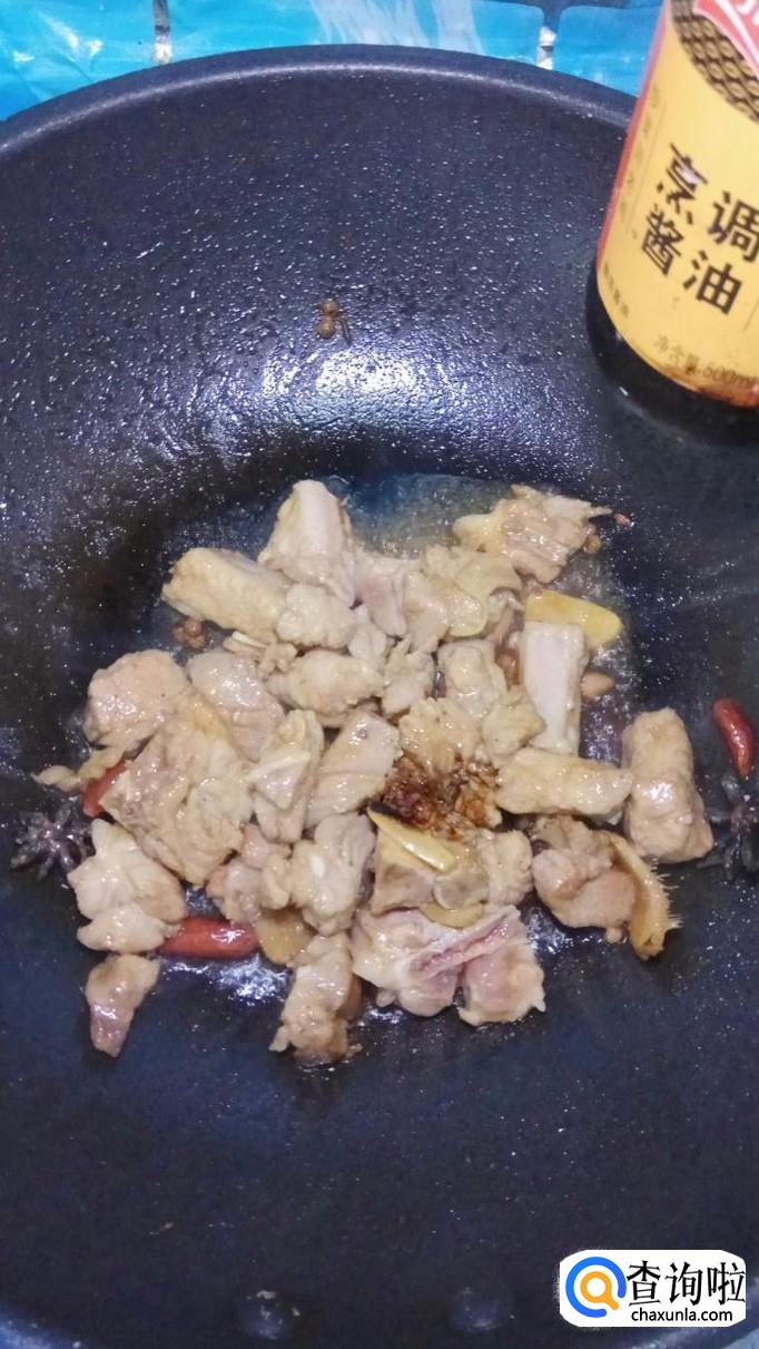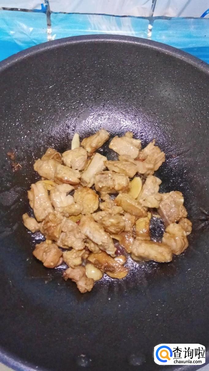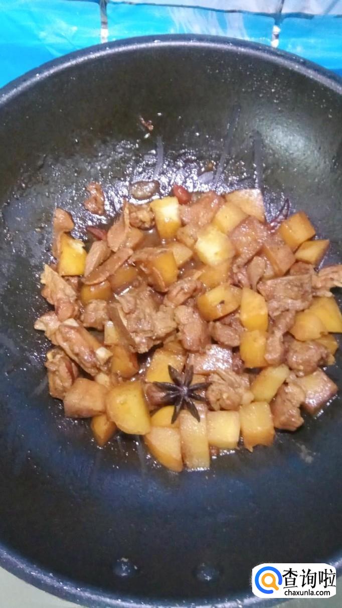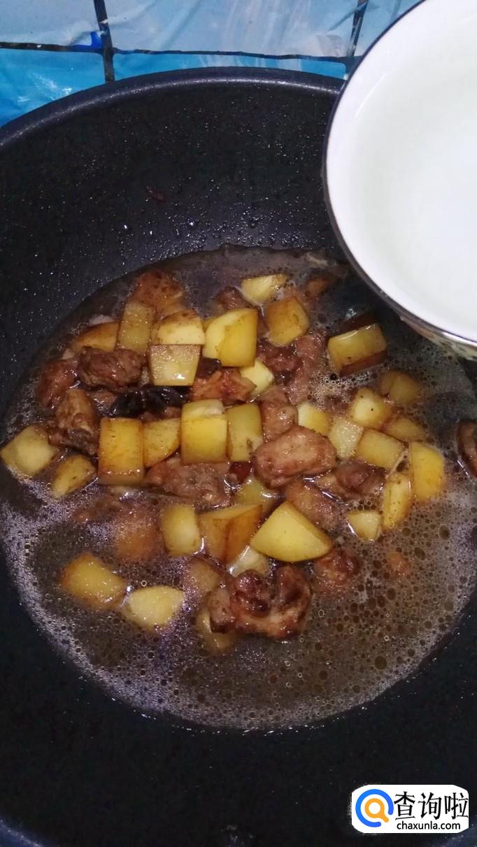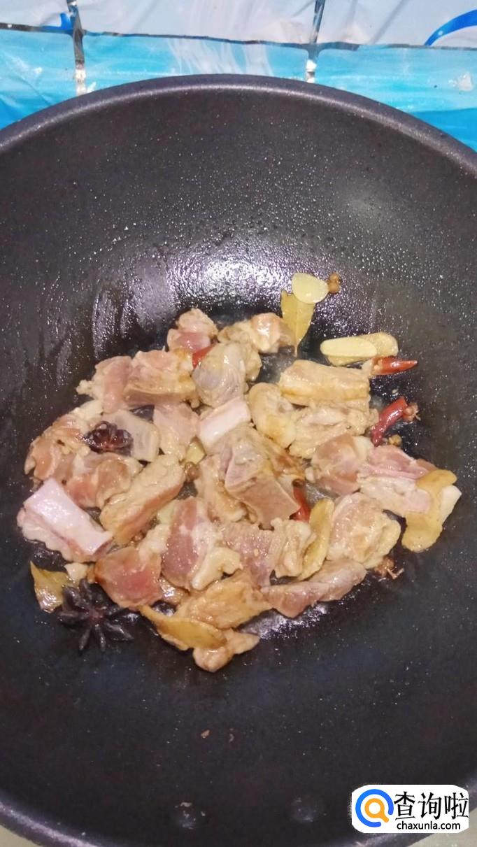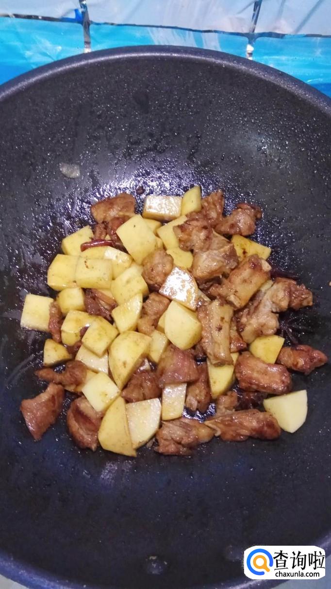 准备一个土豆,洗净去皮后,切成块儿,洗去淀粉,倒入锅中,和排骨一起翻炒。