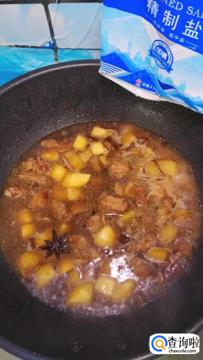 加入小半碗清水,再加入少许盐,盖上锅盖,大火将水烧开,转小火炖20分钟左右,将汤汁收干。