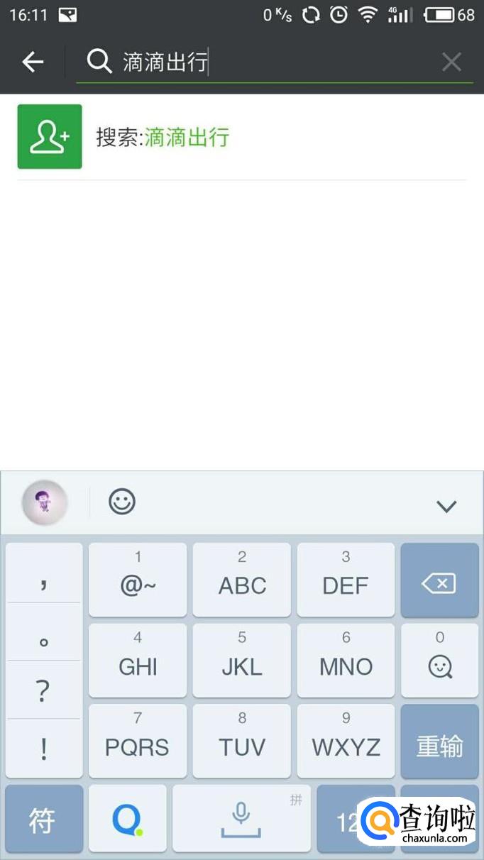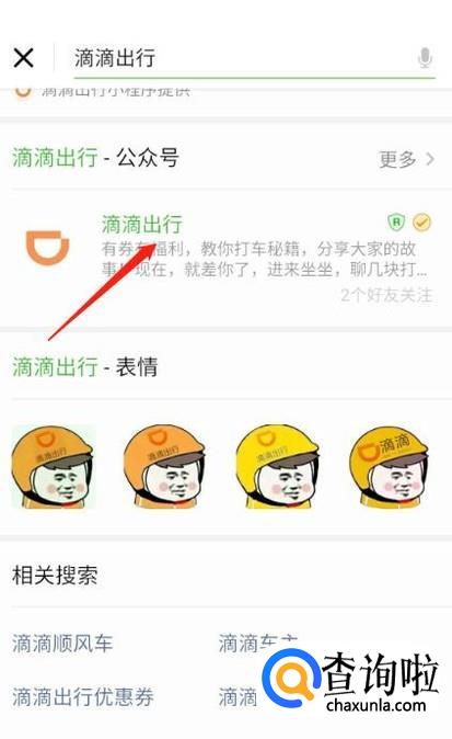 进入后我们在搜索框内输入“滴滴出行”后点击查找,然后下拉找到公众号栏目,点击改公众号进入。