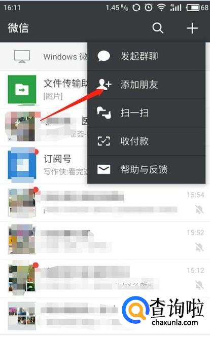 首先我们打开微信号,点击上方的“+”号,点击“添加朋友”进入。