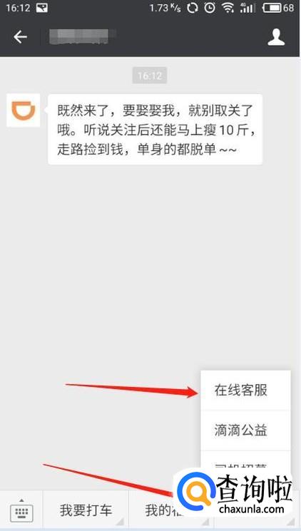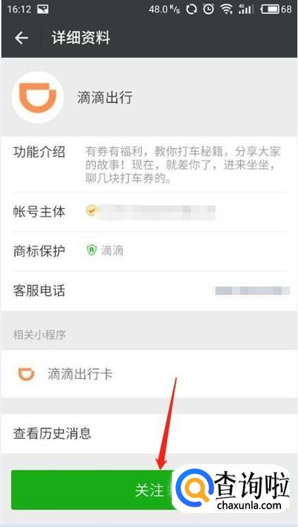 进入后会跳转到滴滴出行公众号的关注页面,我们点击“关注”。