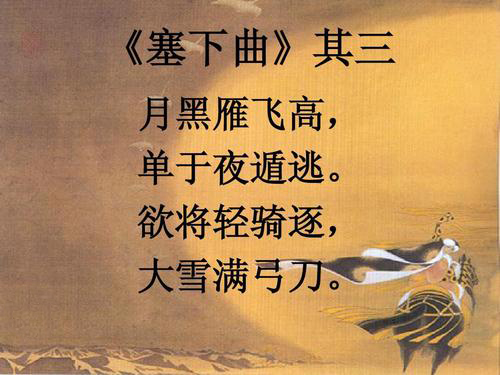 三、四句写己军准备追击的情形,表现了将士们威武的气概。“欲将轻骑逐”,是追兵将发而未发。不用大军而仅派“轻骑”,绝不仅仅因为快捷,同时也还显示了一种高度的自信,仿佛敌人已是瓮中之鳖,只须少量“轻骑”追剿,便可手到擒来。当勇士们列队准备出发时。虽然站立不过片刻.而大雪竟落满弓刀。“大雪满弓刀”一句,又发惊采,将全诗意境推向高潮。在茫茫的夜色中,在洁白的雪地上,一支轻骑兵正在集结,雪花顷刻便落满了他们全身,遮掩了他们武器的寒光。他们就像一支支即将离弦的箭,虽然尚未出发,却早就满怀着必胜的信心。这是一幅非常动人的画图:在静谧中蕴藏着呐喊,在昏暗中酝酿着闪电。虽然是在漆黑的夜间,勇士们被白雪勾画出的英姿仍然是“焕尔触目”。