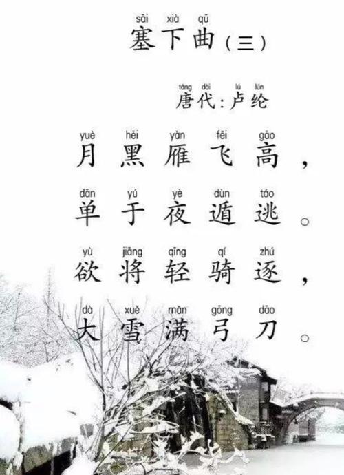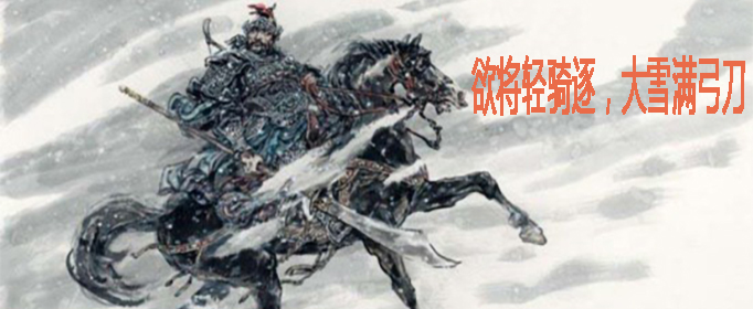 “欲将轻骑逐,大雪满弓刀”的意思是正要带领轻骑兵去追赶,大雪纷飞落满了身上的弓刀。该句出自唐代诗人卢纶的《和张仆射塞下曲·其三》,全诗是:月黑雁飞高,单于夜遁逃。欲将轻骑逐,大雪满弓刀。意思是:死寂之夜,乌云遮月,天边惊起一群大雁。原来敌军首领趁着夜色悄悄逃跑。正想要率领轻骑一路追杀,纷纷扬扬的一场大雪,已经洒满了将士们的弓刀。