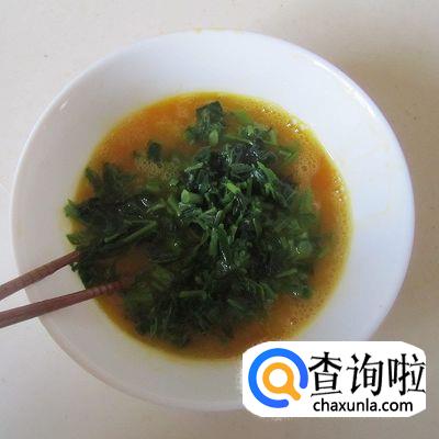 鸡蛋打散成蛋液,与刚才的香椿碎混合后,加少许盐搅拌均匀;
