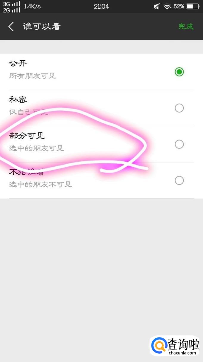 最后,我们完成上一步后,会出现“公开,给部分好友看,不公开”等,我们点击“给部分好友”这时我们会进入另一个页面,我们勾划出不给看朋友圈的好友,即可