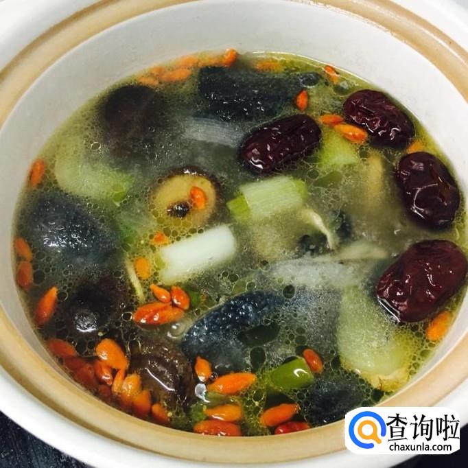 红枣香菇乌鸡汤 把乌鸡洗干净方盆中加入酒、盐等腌制,然后倒入锅中并加入足量的水,把香菇和红枣洗干净后倒入,先用大火炖30分钟左右,待乌鸡肉孰了之后再用小火炖15分钟可起锅。
