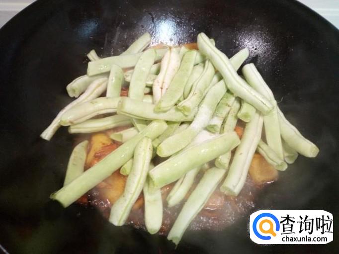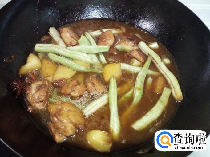 土豆翻炒两分钟的时间,放入芸豆翻炒,放入盐。翻炒至芸豆没有水气后,放入清水,水和鸡腿,土豆,芸豆一平,大火烧开,转小火慢炖。