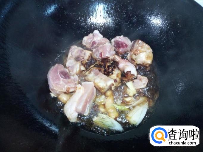炒至白糖起泡,颜色变红,放入鸡腿翻炒。放入葱,姜,花椒,八角,料酒,酱油。