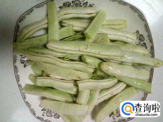 芸豆掐去两头,用手掰成段,用水清洗干净,控干水分。