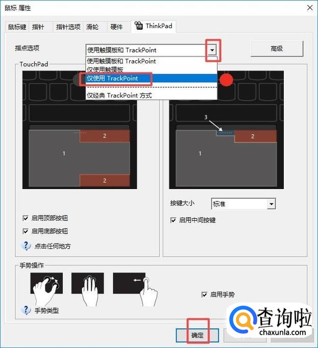 弹出的界面,我们点击图示中的下拉箭头,弹出的界面,我们选择仅适用TrackPiont,之后我们点击确定就可以了。这样就将触摸板禁用了。