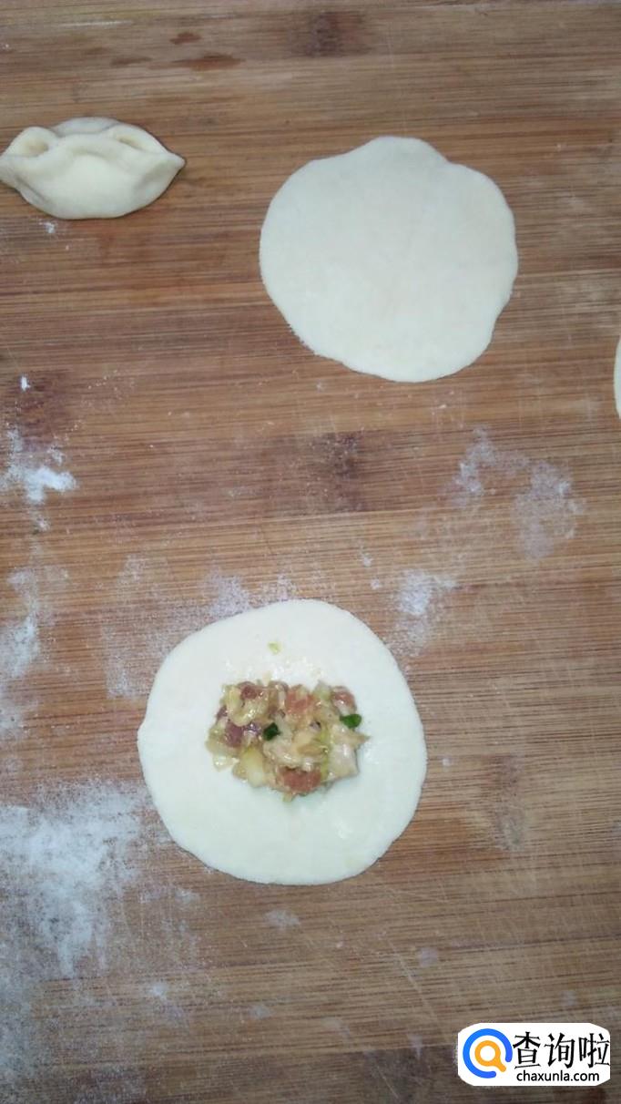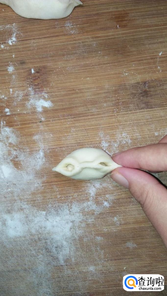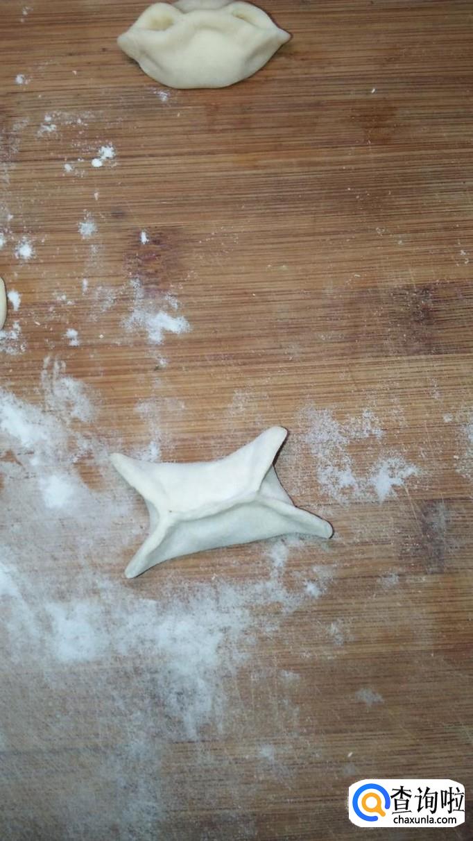 将馅儿放在擀薄的饺子皮上面,先在中间捏一下,然后两边各捏出两个角,用手在两边再捏一下,将每边的两个角捏在一起,元宝水饺就做好了。