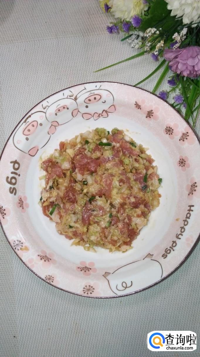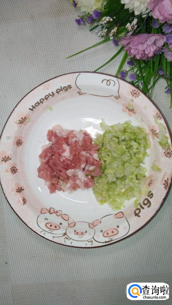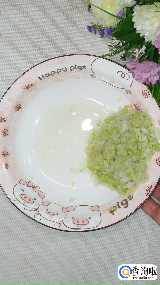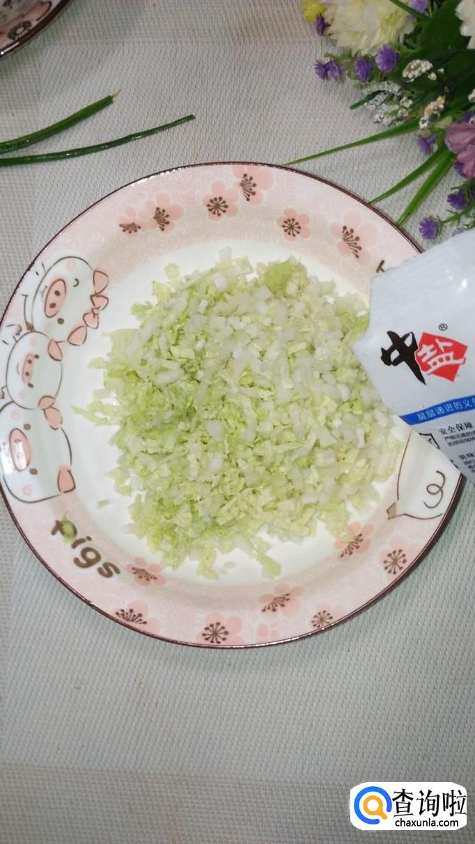 将白菜叶洗净后切碎,加入少许食盐,腌出水分,将水分倒掉。注意,白菜尽量切得碎一些,这样才能更好的和肉粘在一起。