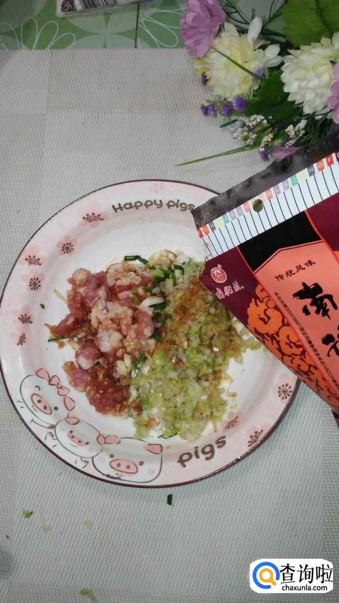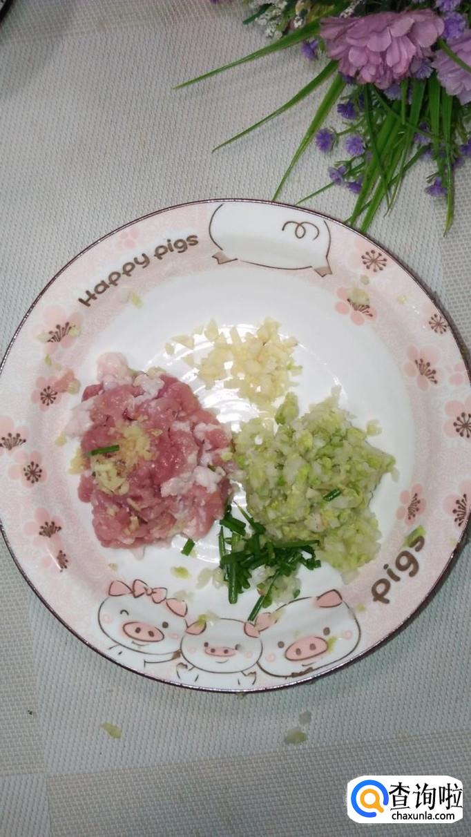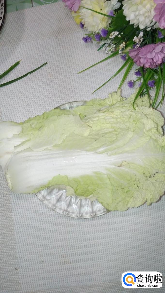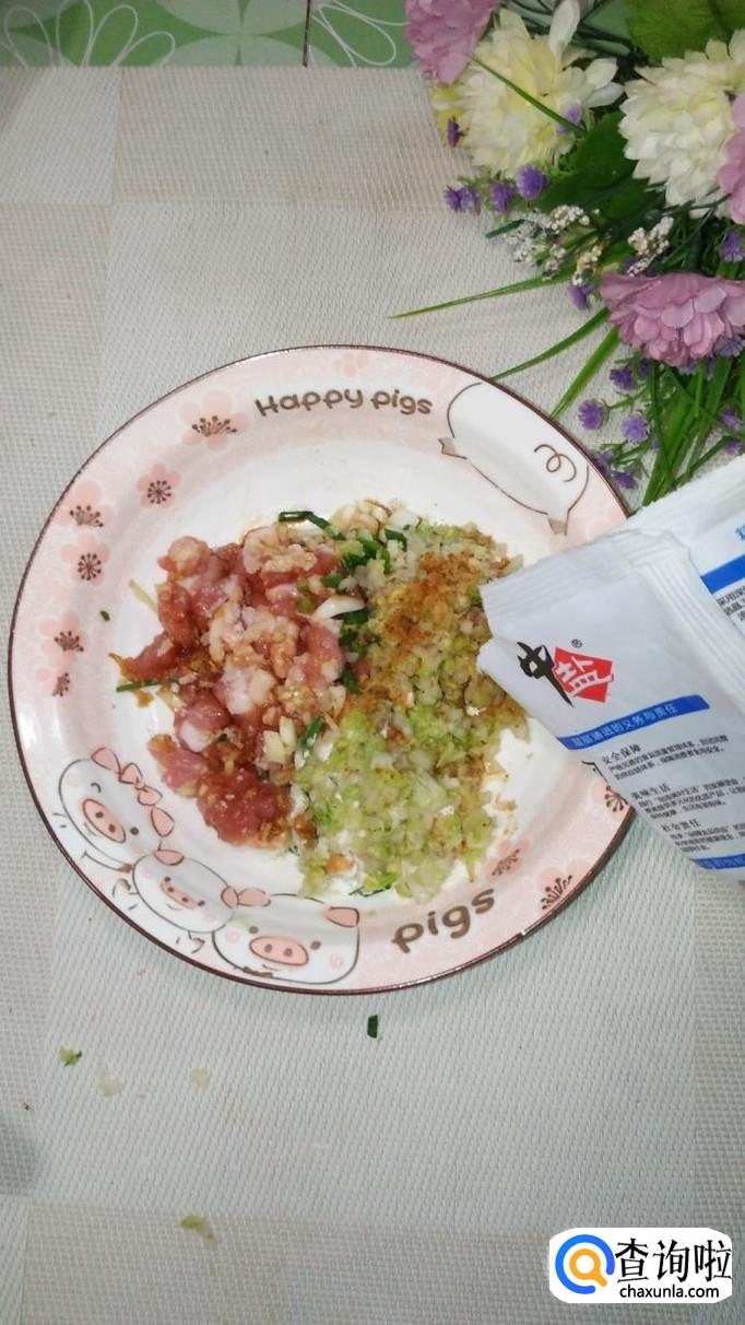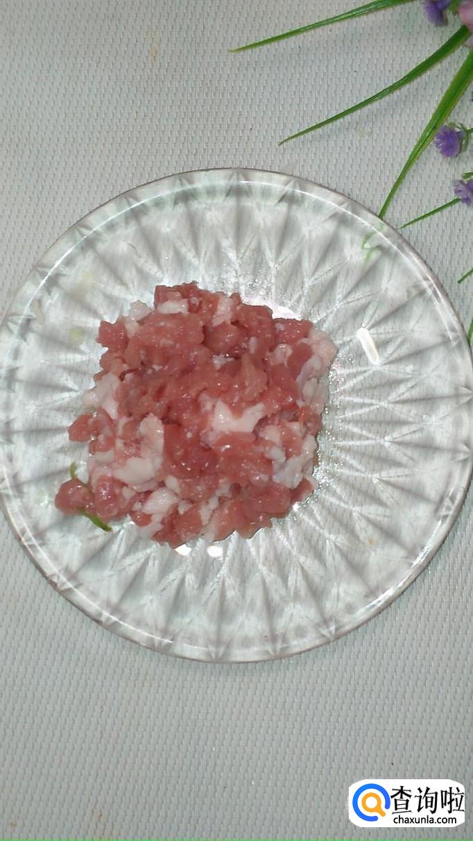 将白菜叶洗净后切碎,加入少许食盐,腌出水分,将水分倒掉。注意,白菜尽量切得碎一些,这样才能更好的和肉粘在一起。