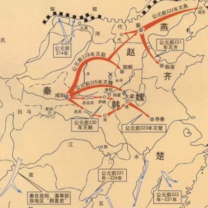 秦国从公元前230年攻打韩国到前221年灭齐国结束,共计10年的时间,先后按顺序消灭韩、赵、魏、楚、燕、齐六国,结束了中国自春秋以来长达500多年的诸侯割据纷争的局面,建立了中国历史上第一个君主中央集权国家,即秦朝。秦朝就是中国历史上第一个统一的中央集权的封建王朝。