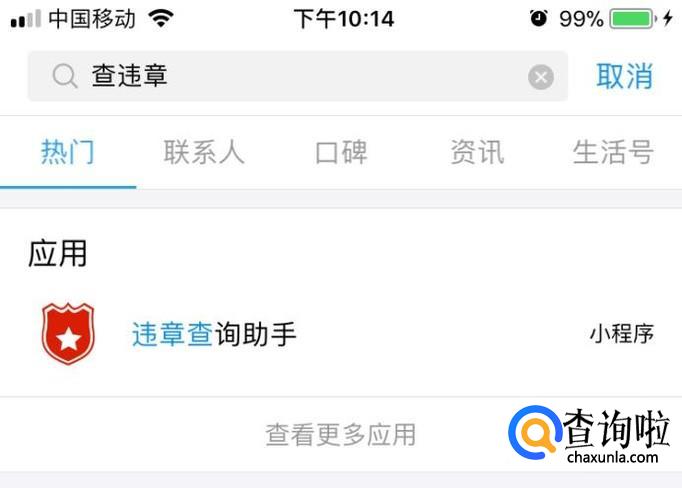 在支付宝的搜索栏搜索查违章,关注查违章的小助手后,进入到查违章小助手的公众号里面。