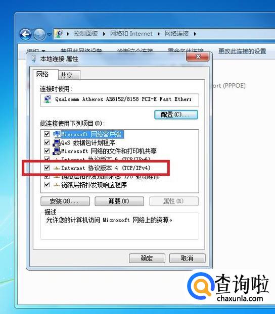 在弹出框中间,找到“Internet协议版本4(TCP4/IPV4)”,双击打开。