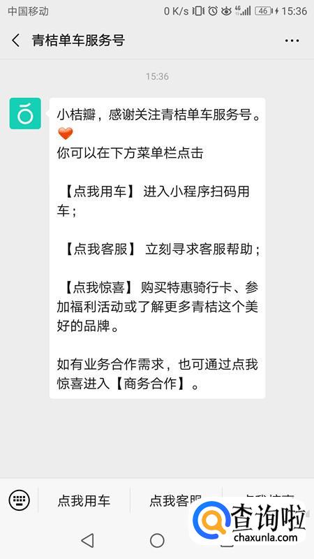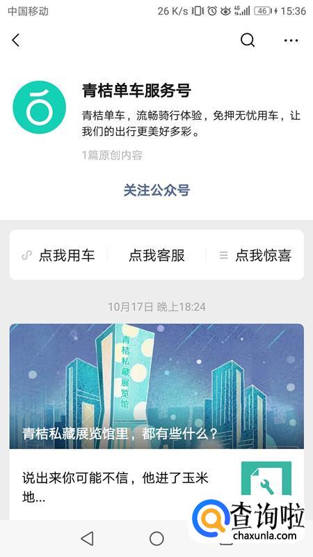 搜索青桔单车服务号,找到正确的公众号点击关注。
