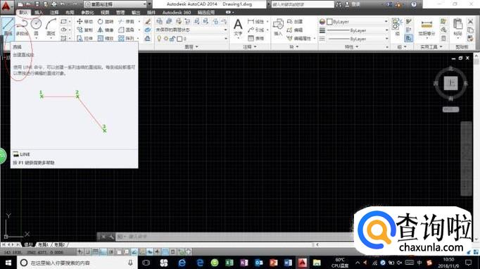 如图所示,选择"默认→绘图"功能区。点击"直线"图标,用于创建一系列连续的直线段。
