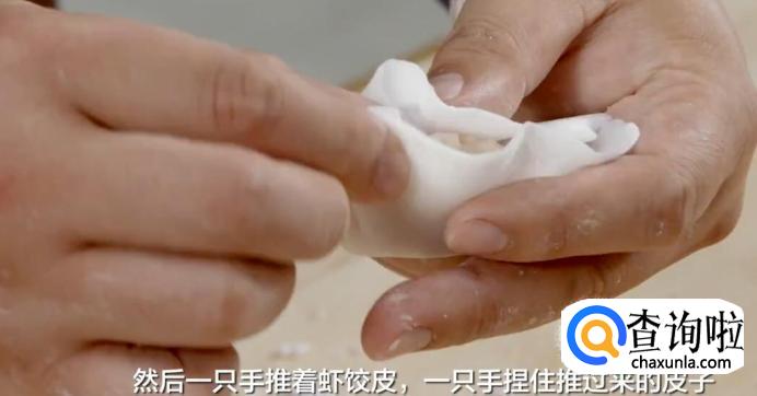 然后一只手推着虾饺皮,一直手捏住推过来的皮子。
