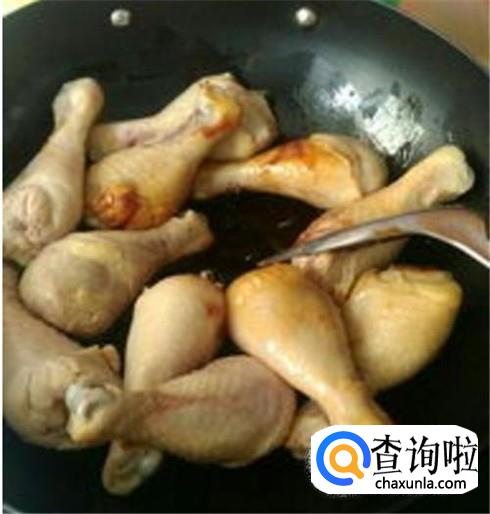 锅里倒油烧热之后,放上一勺子白糖溶化之后把鸡腿放进去,让鸡腿均匀的沾到糖汁,然后加入一勺子生抽翻炒,加上些葱姜蒜,然后加入适当开水盖上锅盖焖。