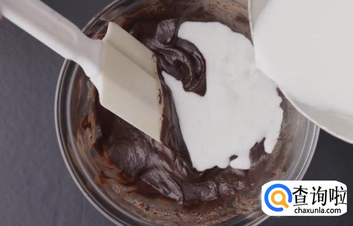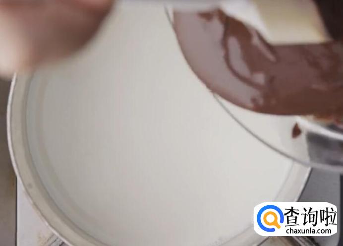 然后在巧克力中分次加入部分奶液。