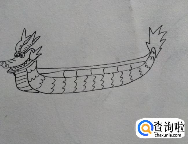 然后对龙舟的船体部分进行一些修饰,再画出舟尾。