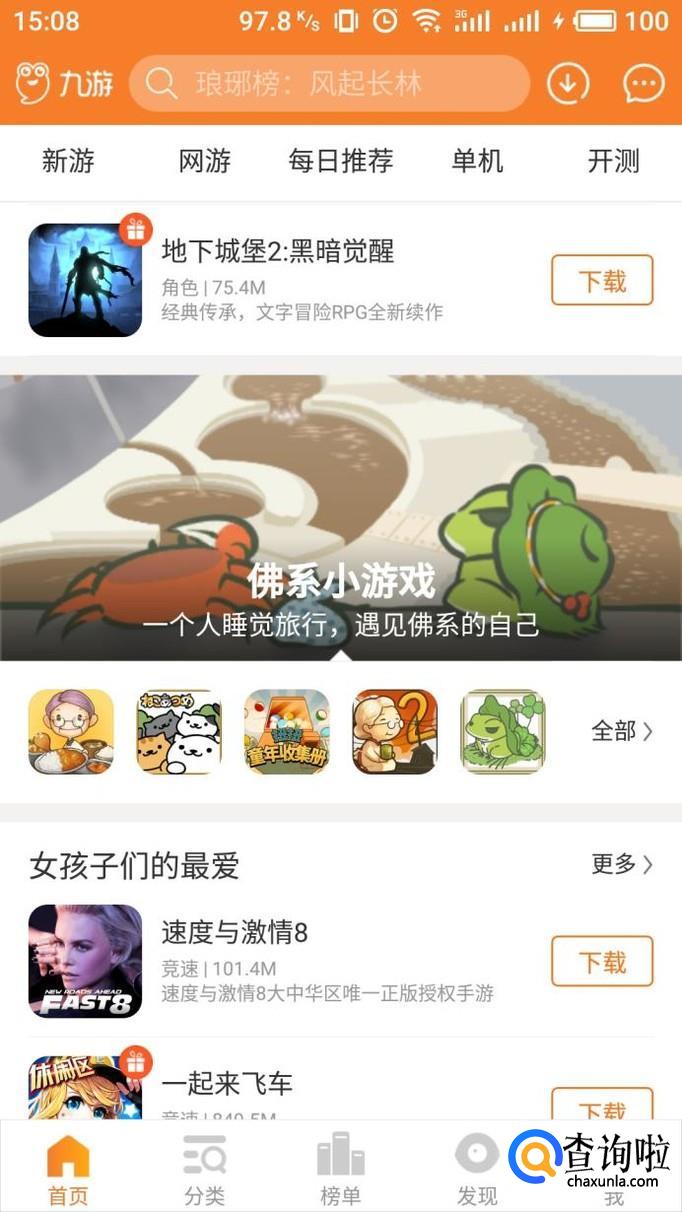 需要知道的是,游戏自带语言只有日文,并且是无法进行更换的,我们在“九游”能够下载汉化版。进入九游界面找到“佛系小游戏”进入。