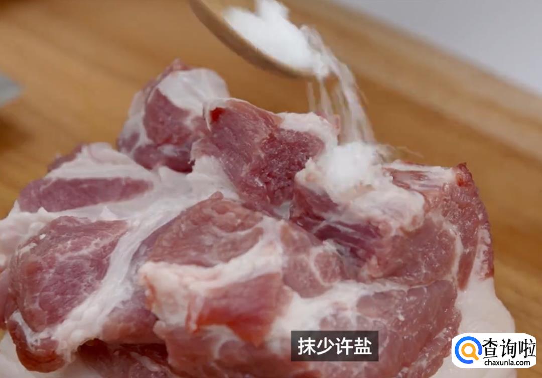 肉选用偏肥一点的五花肉切方块,瘦肉一面划三五公分左右深的十字花刀,给肉抹一点盐。
