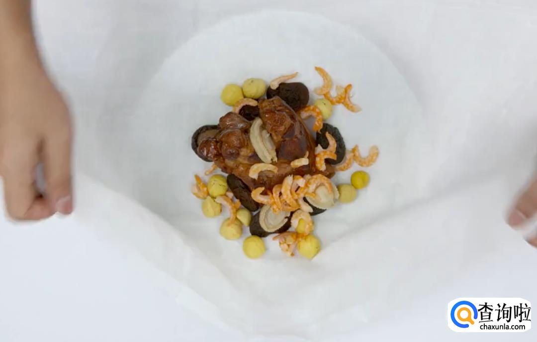 取一块纱布,将肉皮朝下放在纱布中央,放上泡发好的鲍鱼、香菇、栗子、虾干、瑶柱,收口后用绳子扎紧。