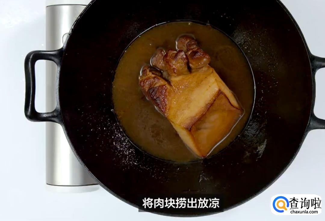 热锅后倒入油,加入白砂糖均匀划散,直到全部融化并熬成焦糖色,将瘦肉面朝下放入锅中,煎至定型上色后翻面,让整块肉都上色。倒入香菇水、老抽、生抽和蚝油熬煮一会儿,猪肉上色至红亮后关火,肉捞出来,锅里的汤汁留用。