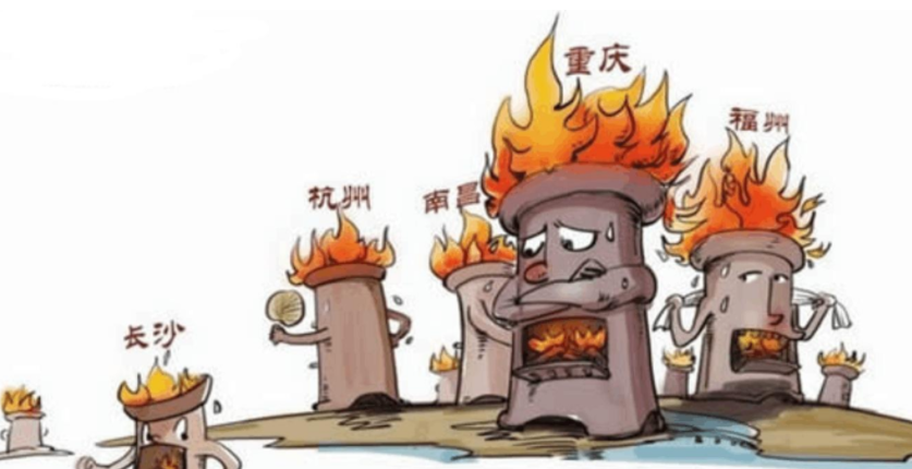 传统“四大火炉”城市:南昌、重庆、武汉、长沙;新“四大火炉”城市:重庆、福州、杭州、南昌。四大火炉是指中国天气炎热程度最严重的四个城市,是对夏季天气最为酷热的四个中国大城市的称呼,一般集中在中国南方的长江流域、及华北黄淮一带。