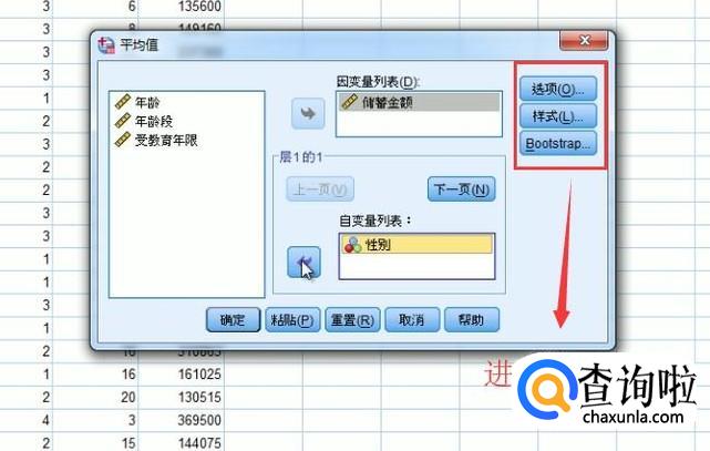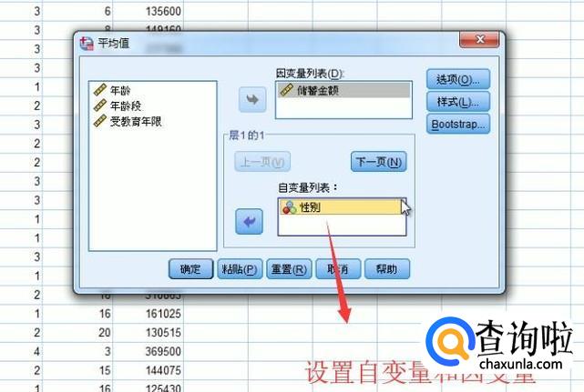 在弹出的平均值界面中我们将储蓄金额放在因变量中,性别放在自变量中,如下图所示