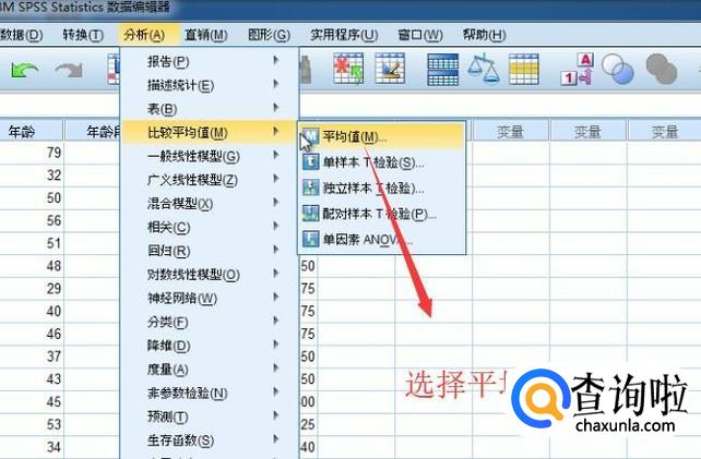 接下来点击顶部的分析菜单,选择比较平均值下面的平均值选项,如下图所示