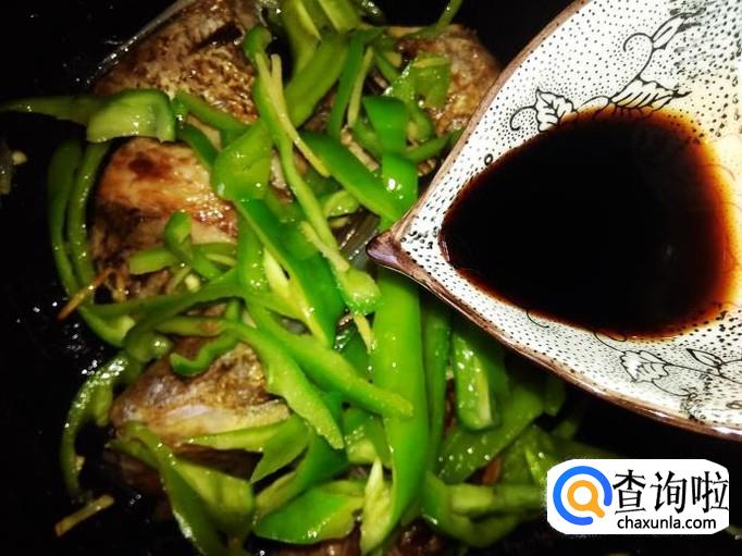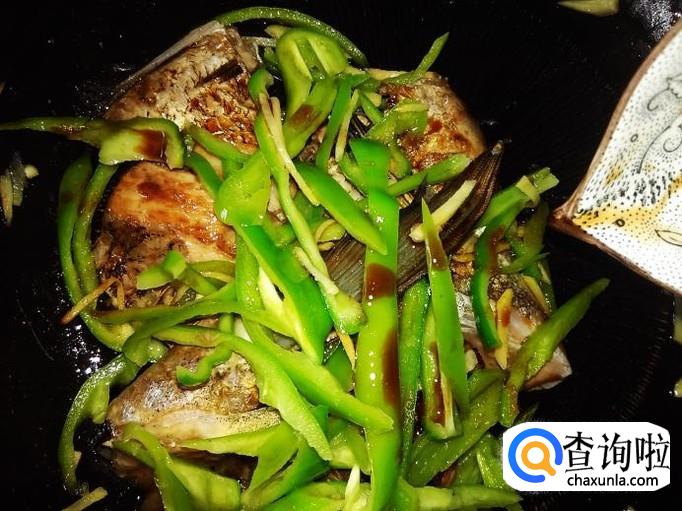 然后把青椒丝铺到鱼面上,加1勺生抽。