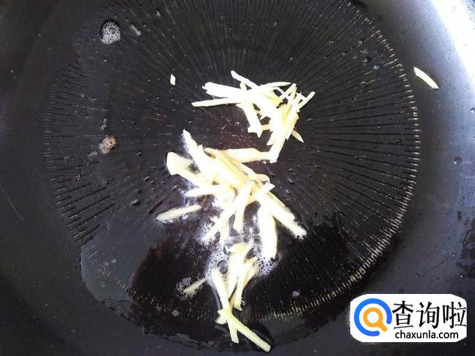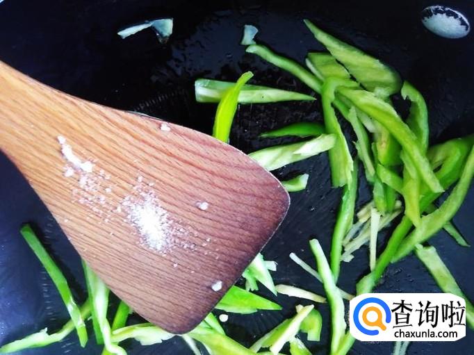 再开火下油,放姜丝进去爆香,然后放青椒丝进去撒少量的盐翻炒至变色。