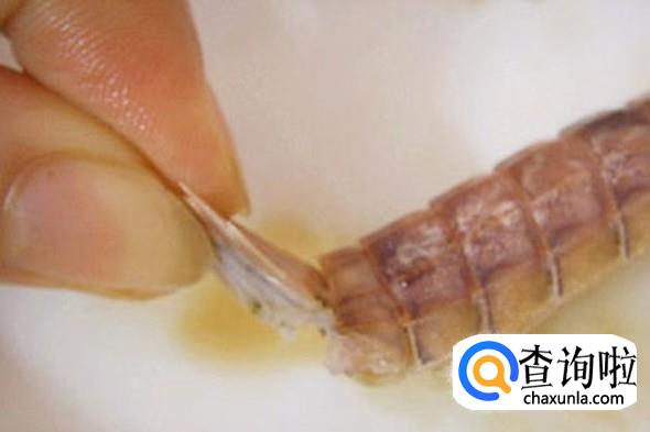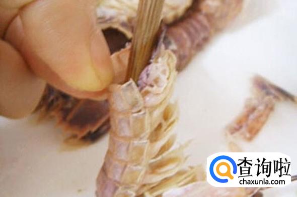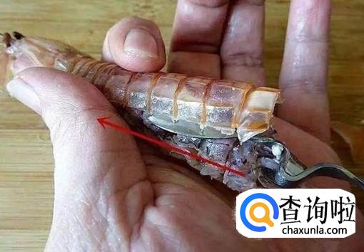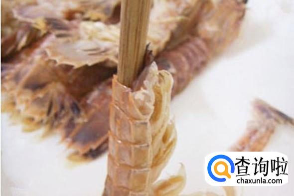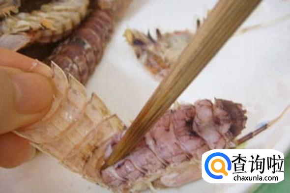 用根筷子从尾部贴着虾壳插到虾头附近。