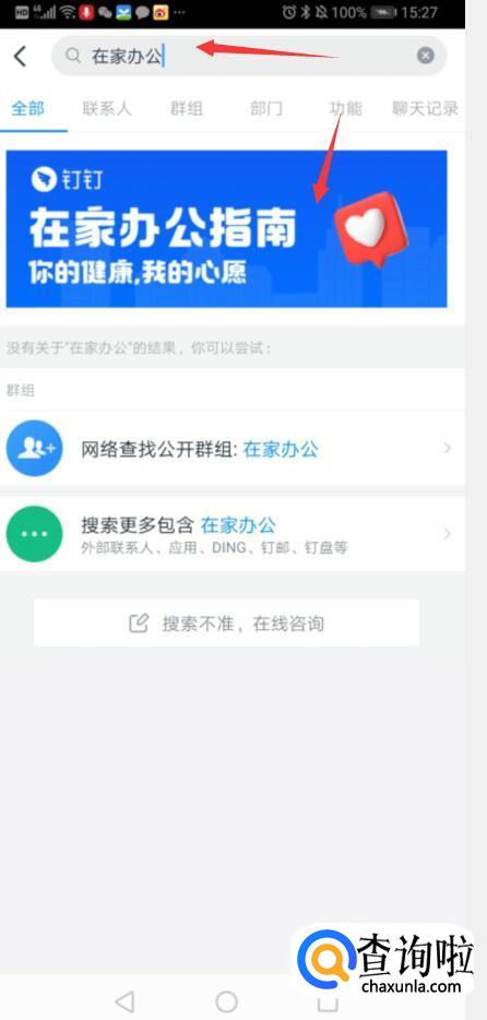 在搜索框中输入“在家办公“,并点击下面的”在家办公指南“。