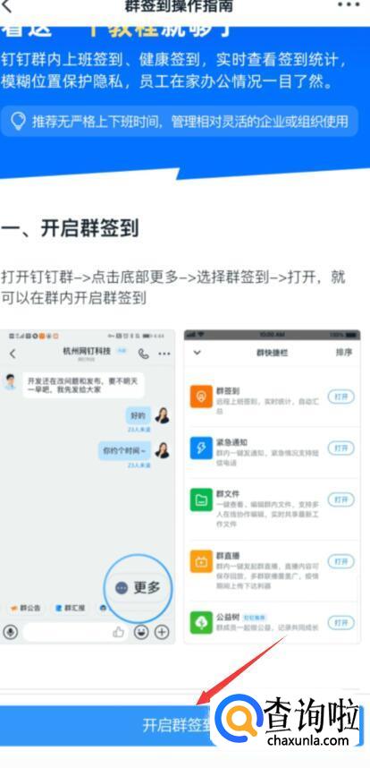 在群签到操作指南页面,点击“开启群签到”按钮。