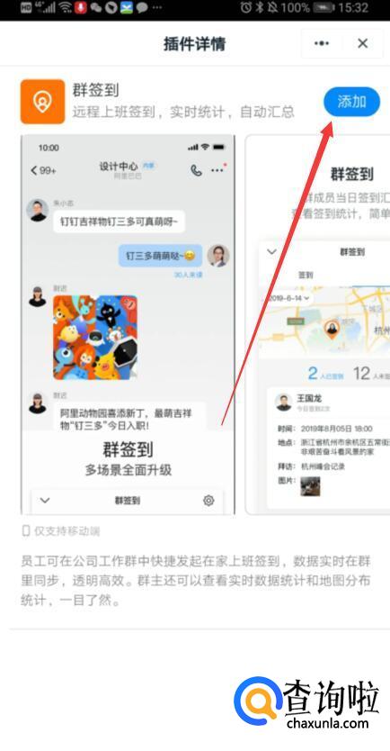 在弹出的页面中,点击“添加”按钮,将群签到功能进行添加,然后如图2所示选择一个要开启群签到的群组。