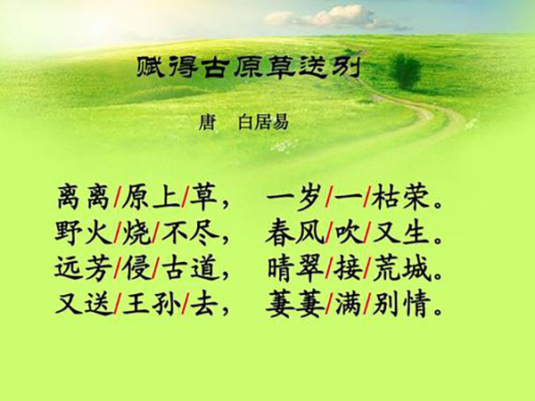 《赋得古原草送别》原文:离离原上草,一岁一枯荣。野火烧不尽,春风吹又生。远芳侵古道,晴翠接荒城。又送王孙去,萋萋满别情。意思是:古原上长满茂盛的青草,年年岁岁枯萎了又昌荣。原野上的大火无法烧尽,春风一吹它又遍地滋生。远处的春草侵占了古道,阳光下的绿色连着荒城。我又在这里送友人远去,萋萋芳草尽是离别之情。