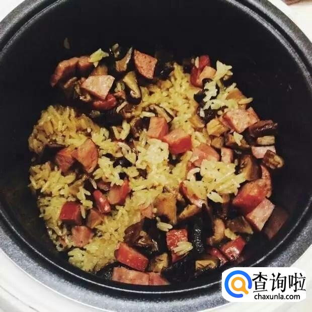 把香菇用凉水泡开(大概要十几分钟),买来就是新鲜香菇就不用泡。把香肠切成丁备用。把泡软的香菇拿出来切成丁,香菇水别倒。把两个丁放锅里炒,出香味就行了。出锅,放生抽或者酱油搅拌,可以放多一点。米洗好,把香菇水倒进去当煮饭用的水,撒点盐,把炒好的丁放进去。水的量能够没过丁的中部就行了,不要太多。等饭煮好就可以吃了。