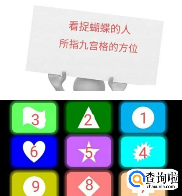 抓蝴蝶的游戏规则是看手的位置,可以想象出题人面前有个九宫格,从上到下,从右向左数字依次为1、2、3、4、5、6、7、8、9,看他的手放在哪个格子里,蝴蝶数目的答案就一目了然了。