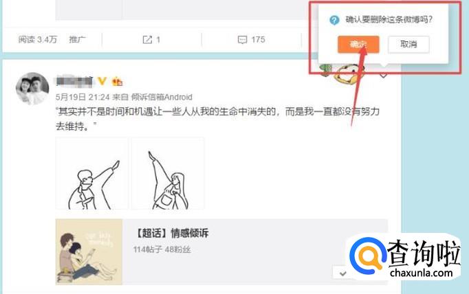 然后会有一个提示: 确认要删除这条微博吗?点击确定,微博就删除成功了。