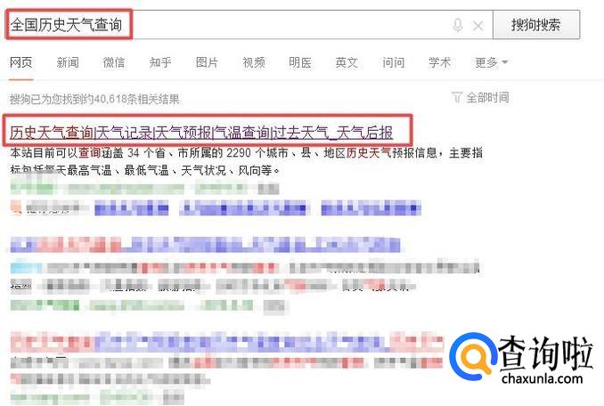 首先,我们打开我们电脑上面的浏览器,然后我们在搜索引擎中输入全国历史天气查询,之后按回车键,弹出的界面,我们点击图示中的网站;