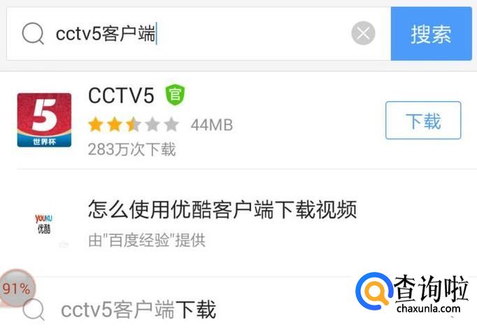 打开手机浏览器,搜索“CCTV5客户端”,在显示的链接里点击“下载”。