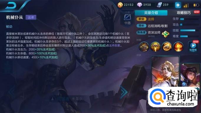 被动:机械仆从。米莱狄直接击杀的敌方生物死后会召唤出机械仆从对敌人造成伤害,机械仆从的速度,伤害和血量都随法强增加。