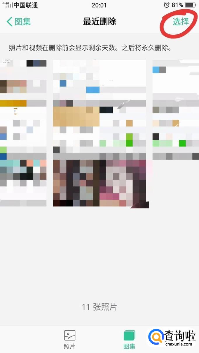 点击“最近删除”,进入页面之后,点击右上角的“选择”
